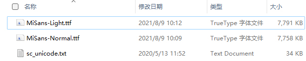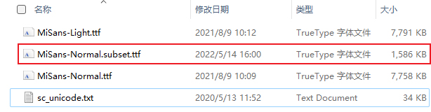 MiSans-Normal.ttf是目录中待压缩的字体名称,sc_unicode.txt为字符编码。 执行完命令,压缩完成,目录中出现已压缩的字体,可以看到压缩效果还是可以的。