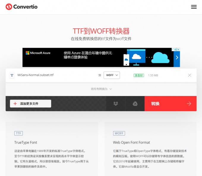 - 在浏览器中搜索字体格式在线转换,将刚才已经压缩好的字体导入,进行进一步压缩。这里使用Convertio。