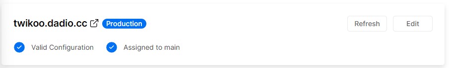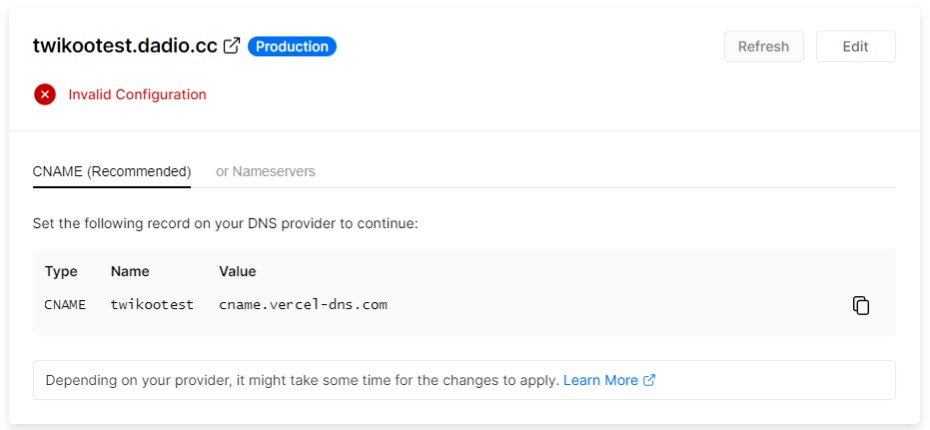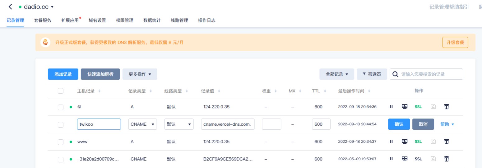Name,记录类型为Type,记录值为Value,依次填入后点击确认。 - 此时返回刚刚的vercel页面,会发现子域名已经没有报错了,如果没有反应可点击
