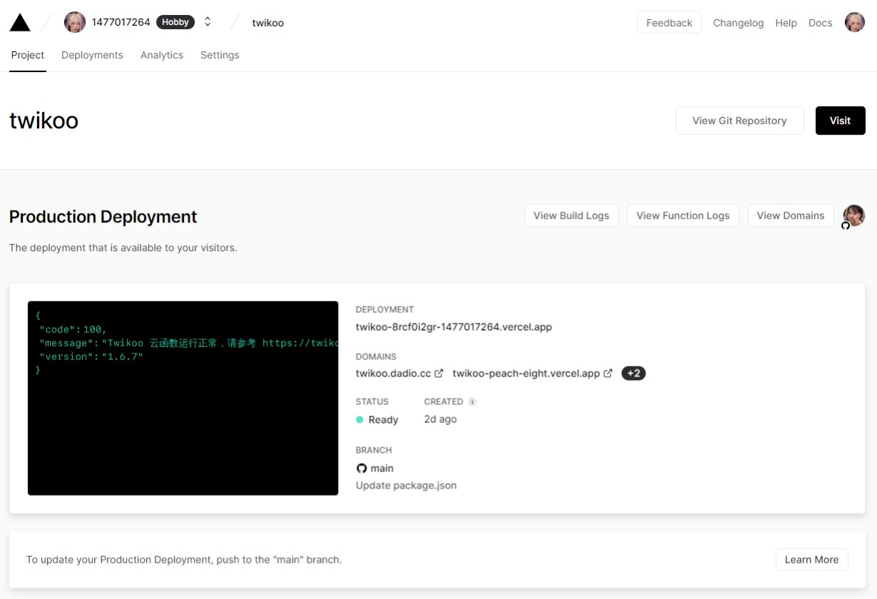 - 打开vercel,进入你的twikoo项目。(由于被墙,大概率需要科学上网)
