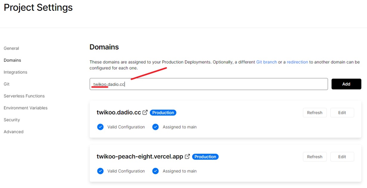 Setting->Domains,在输入框中输入以创建你的子域名,如图所示,前缀随意,但建议使用twikoo方便管理。 - 子域名添加完成后会报错,如下图。不要关闭此页,下面的值一会要用。(我已经添加过子域名,所以图中的子域名为案例)